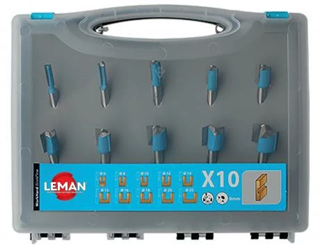 Mallette plastique de 10 fraises droites de défonceuse au carbure. Queue de 8 mm.