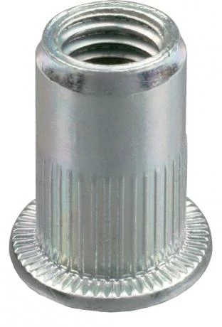 Écrou à sertir aveugle, à tête plate avec crantage sur fût et sur la tête, en aluminium.