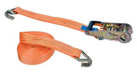 Boucle à rochet (tendeur à cliquet). Sangle en fibre polyester, avec 2 crochets bord de rive.