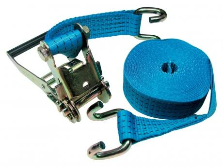 Boucle à rochet (tendeur à cliquet). Sangle en fibre polyester, avec 2 crochets bord de rive.